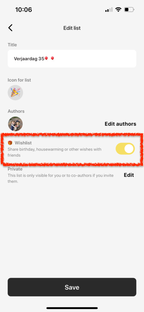 Every list can we be turned into an Wishlist in seconds. You only need to turn the switch ‘Wishlist on’. When you create a new list you can  also turn this switch on.