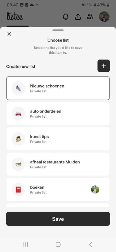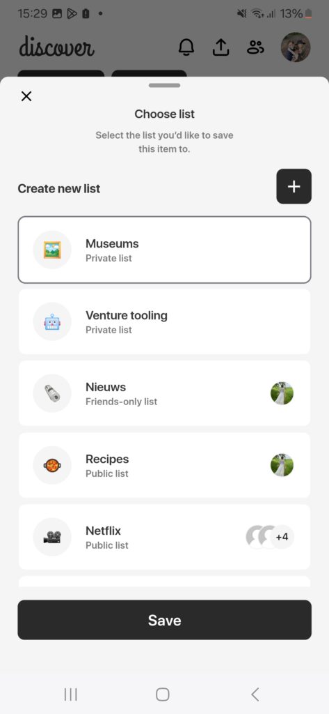 You can save and unsave lists of other users. The lists you saved are shown at the tab ‘saved lists’. You can (un)save lists within a list or at the profile of the list owner.